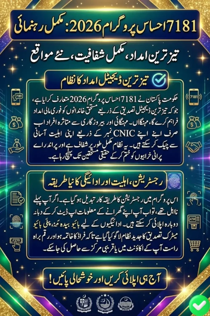 This updated program mainly targets families affected by inflation, unemployment, and rising living costs. The government has connected national data records with the 7181 service to reduce fake registrations and ensure aid reaches genuine beneficiaries. Citizens can now check eligibility through a simplified process using only their CNIC number.