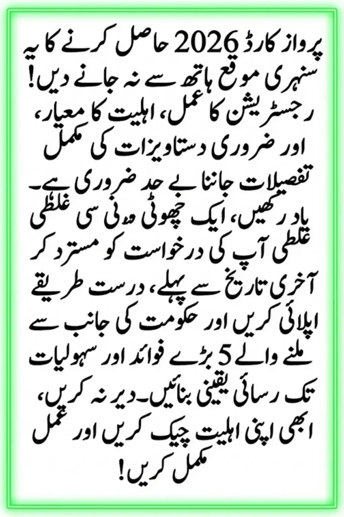 With accurate information and proper documentation, securing your Parwaz Card 2026 can be straightforward and rewarding. Taking action now ensures you meet the deadline and position yourself to benefit from everything the program offers.