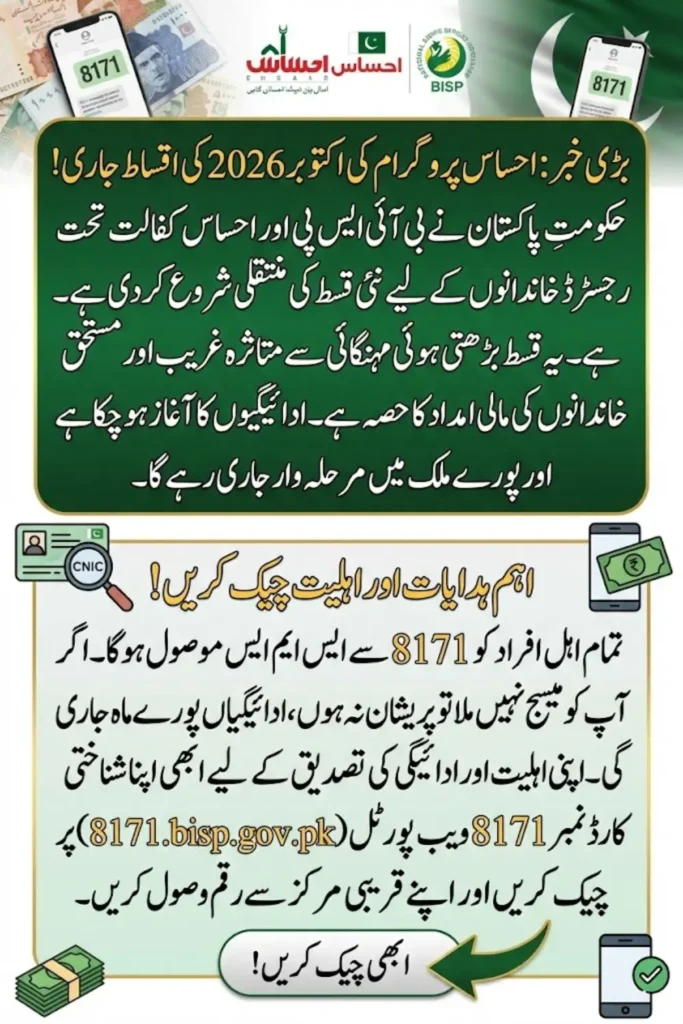 “Ehsaas Program October 2026 Payments have started. Check your CNIC on 8171.bisp.gov.pk, confirm your eligibility, and collect your payment from your nearest center free, safe, and easy.”
